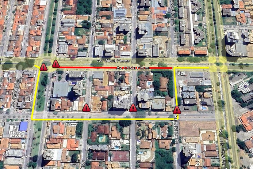 A pavimentação da ciclovia continuará nesta terça-feira (30), quando também será feito o recapeamento asfáltico da avenida. Para isso, será interditado o trecho da Olívia Flores (sentido Centro-Uesb), entre os cruzamentos da Avenida Brasil e Jesiel Norberto, conforme o mapa.